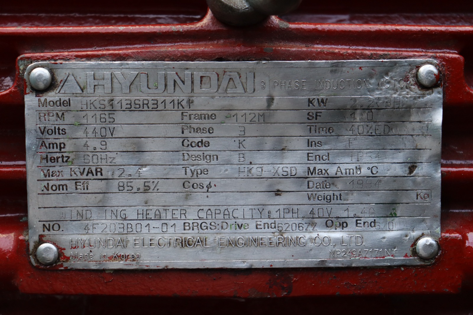 | MOTOR DETAILS | HYUNDAI MODEL: HKS113SR311K, KW: 2.2 (3HP), FRAME: 112M, PHASE: 3, VOLTS: 440, RPM: 1165, AMP: 4.9, HZ: 60, IP 54, TYPE: HK9-XSD, BRG: 6206ZZ, HEATER CAPACITY: 1PH, 40V, 1.4 H |
