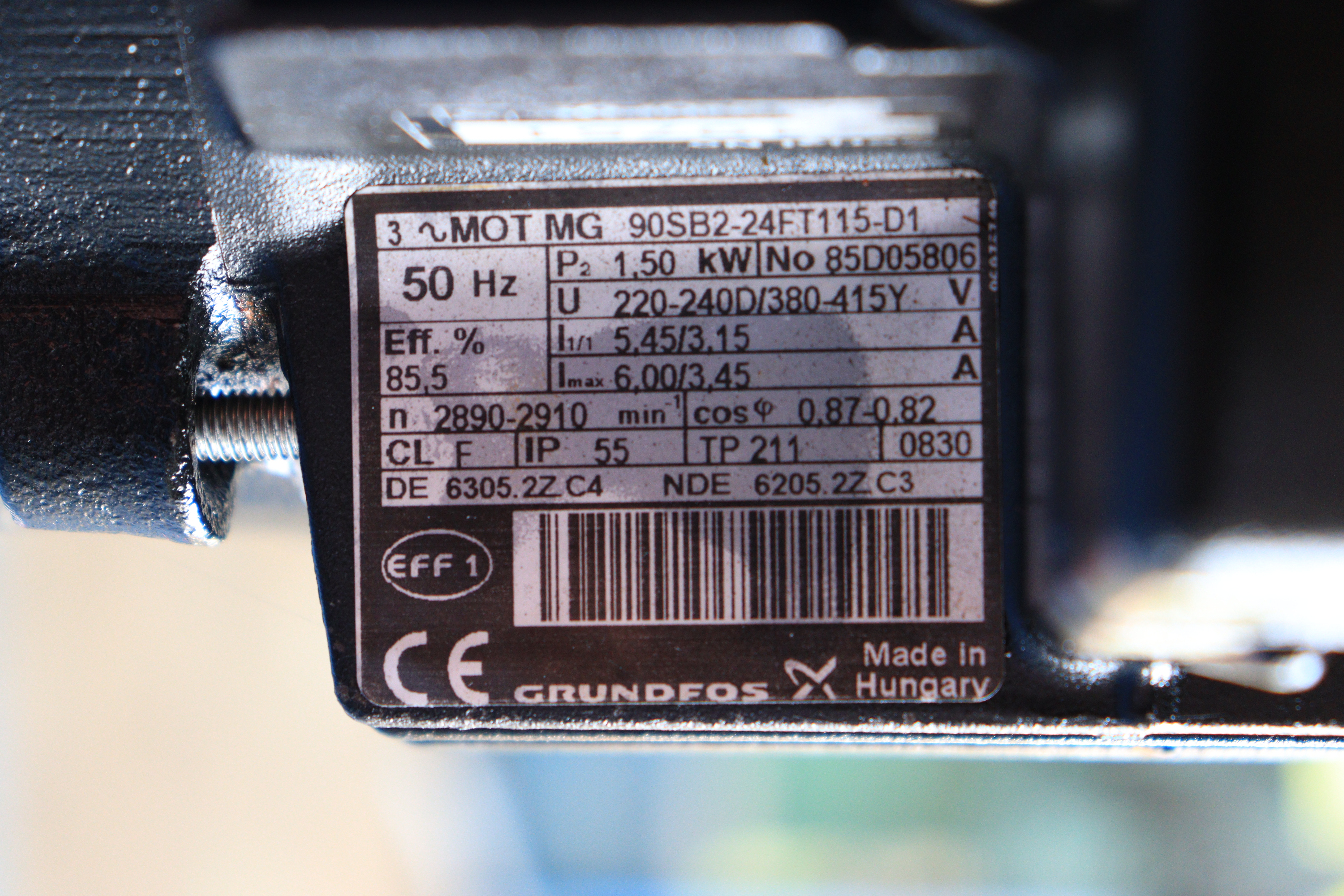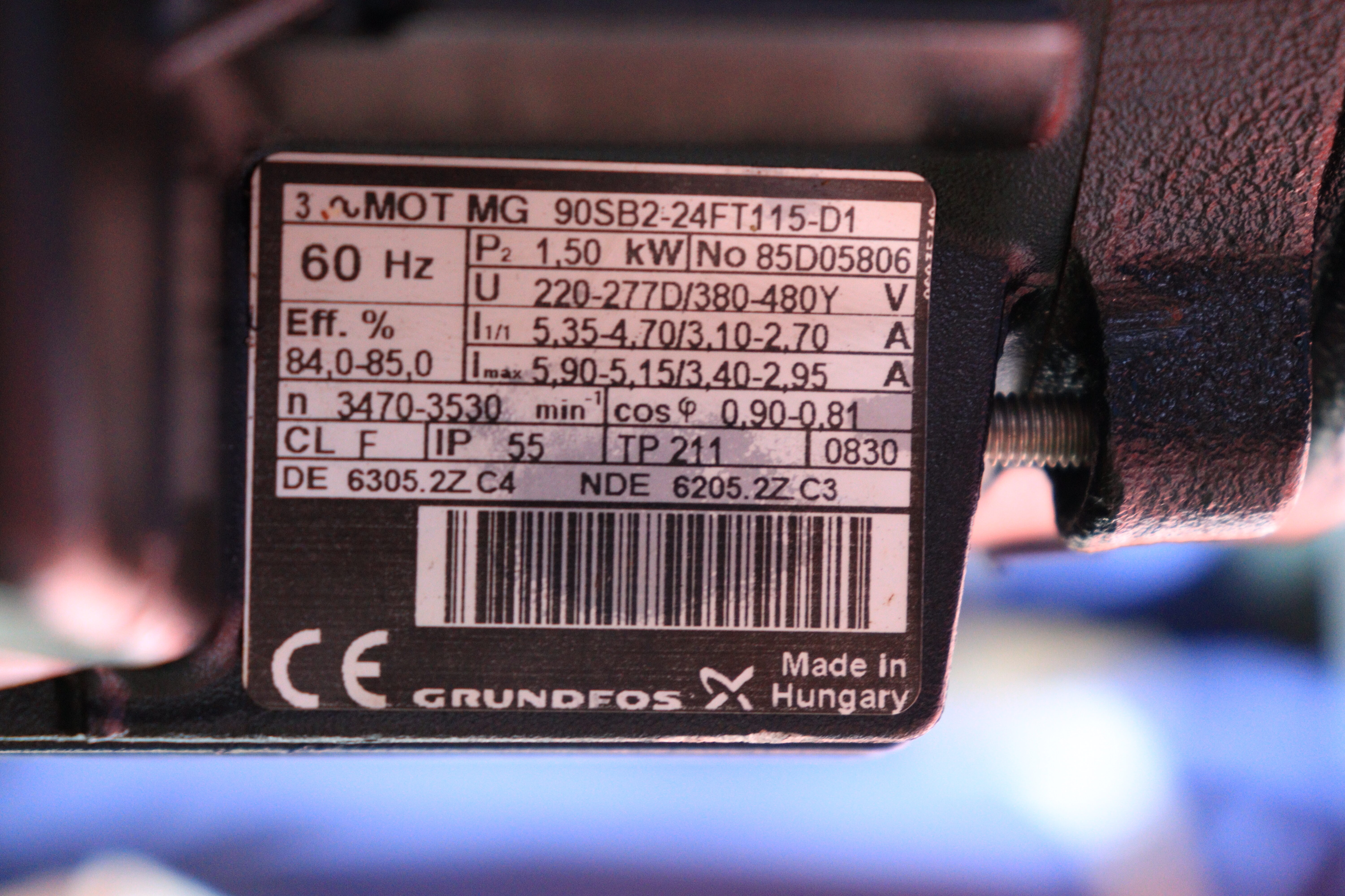 | MOTOR DETAILS | TYPE: MG 90SB2 – 24FT115 – D1, HZ: 50/60, P2- 1.50KW, EFF: 85.5/84.0-85, U 220 – 240D/380 – 415Y/277D/380-480Y V, NO: 85D05806/85D05806, 5.45/3.15 A, 6.00/3.45 A, 6.00/3.45 A, 5.35-4.70/3.10-2.70A, 5.90-5.15/3.40-2.95, IP: 55/55, 2890-2910, 0.87-0.82, 3470-3530, 0.90-0.81, TP: 211/211, DE: 63052ZC4/ 63052ZC4, NDE:62052Z C3/62052Z C3 |